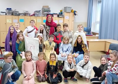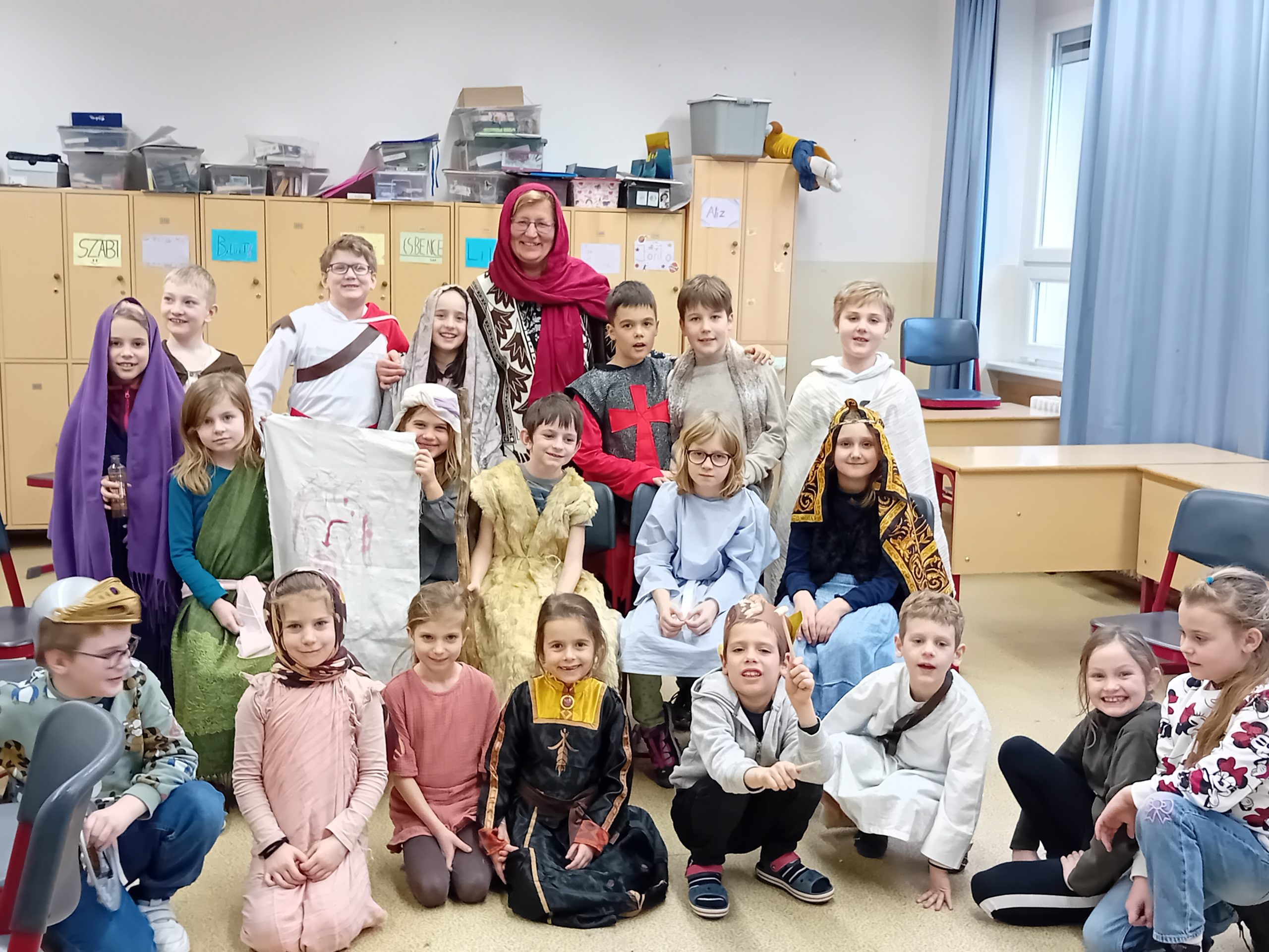 Mind a hat csoportban sokféle megoldás született a jelmezek vagy apró jelképek bemutatására. Nagy segítség volt a szülők támogatás a felkészülésben. Veronika kendője, Keresztelő János szőrruhája, katonai jelmezek, samariai asszony kőkorsója és számtalan szép megoldásban gyönyörködtünk együtt